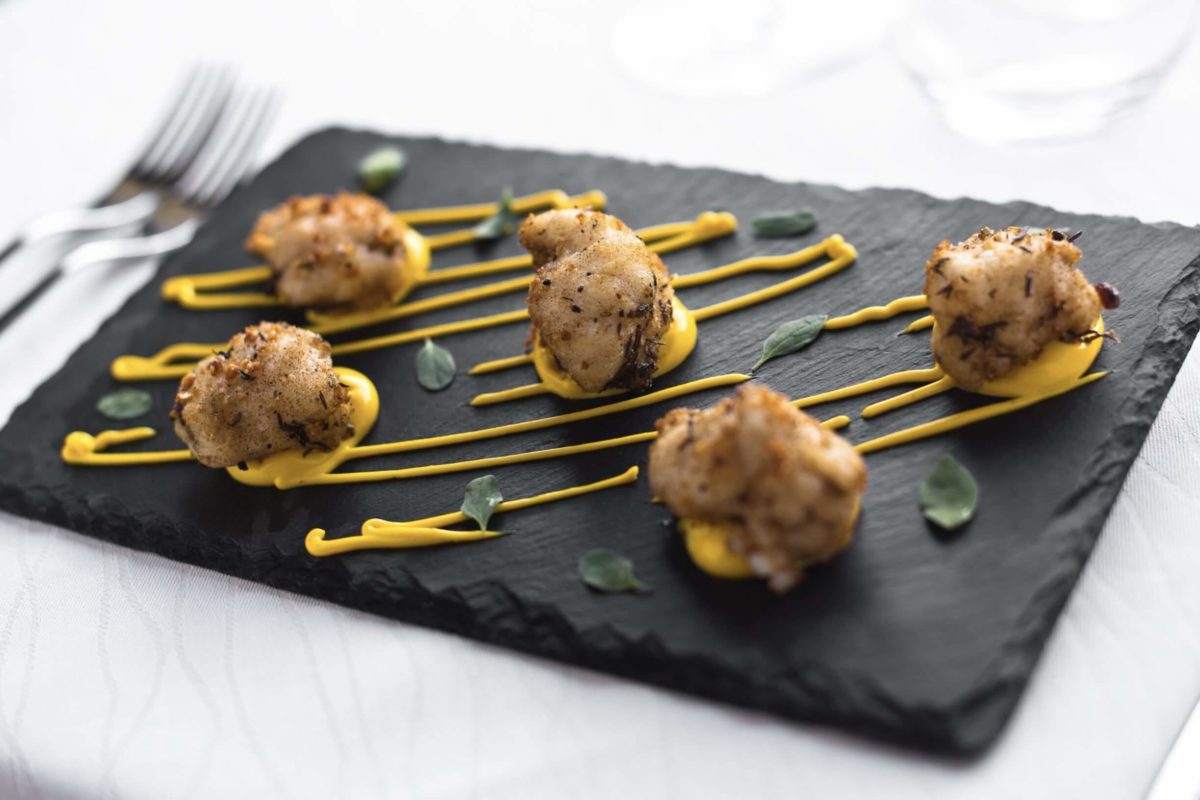 Tortellacci al nero di seppia ripieni di baccalà mantecato su mousse leggera allo zafferano